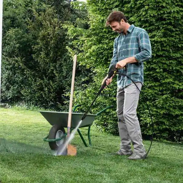 • Velika prednost ovog modela je Quick Connect sistem, koji omogućava brzo i jednostavno povezivanje i odvajanje creva visokog pritiska. Crevo dužine 3 metra pruža dovoljno fleksibilnosti za rad na različitim površinama. Takođe, uređaj ima pametno osmišljene držače za odlaganje pribora, pa su pištolj, crevo i nastavci uvek uredno organizovani.